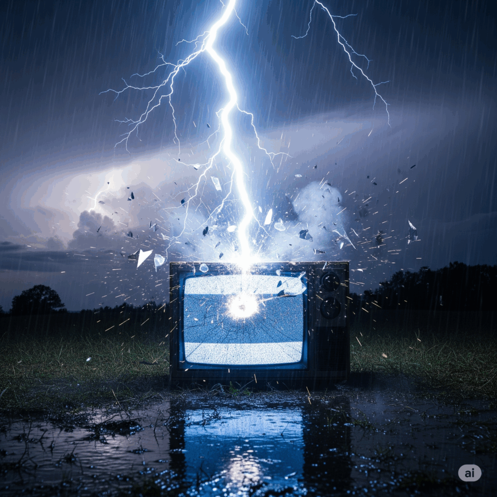 Todavía recuerdo aquella tarde en la que mi hermana había tenido un mal día y renegó de dios, después de eso cayo un rayo cerca de nosotros a consecuencia de eso una televisión grande de esas que todavía eran de caja se descompuso, la televisión estaba apagada pero conectada a la energía eléctrica de la pared. tal vez fue una coincidencia o no, lo cierto es que si se descompuso la televisión debido a la descarga eléctrica.