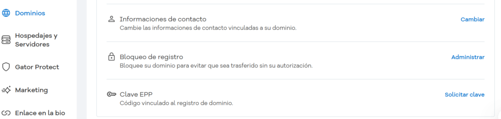 En la plataforma-inicial encontraremos en la sección dominios la opción de desbloquear el dominio y generar el código epp.